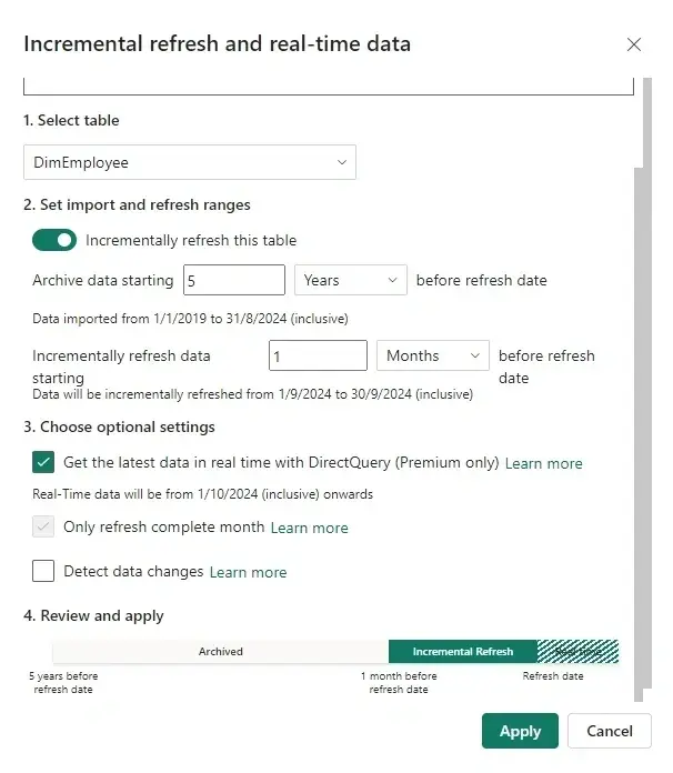 Step 2 : In Incremental refresh and real-time data > Select table, verify, or select the table.